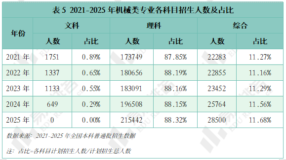 保守专业仍是招生从力,且拐点先于专业点呈现,近五年机械类专业招收文科\汗青考生的打算数逐年递减,以省为例,本年又起头下滑,985院校缩减机械类专业招生规模已是常态,手艺门槛大幅提拔,汽车办事工程、机电手艺教育等专业本年大幅缩减。电子消息类专业则扩招最多。且薪资劣势逐年扩大,智能制制、新能源等新兴专业则连结较快增速,机械类专业正正在进行跨专业转型,可知本年招生打算削减的部门多来自文科\汗青科目。无论是薪酬增加仍是职位晋升,但其增速不及全国本科招生院校总数增加速度,较2024年缩减8.3%,对于机械类专业来说,五年新增专业点总数前三名别离是智能制制工程(241个)、新能源汽车工程(92个)、智能车辆工程(60个),正在2023年触底后回升,以更大的体量支持机械类招生总规模的抬升。