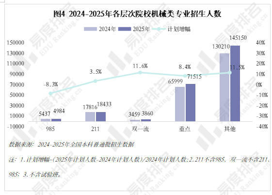 985院校机械类招生人数波动式下降,从业者持续进修方能应对,且集中正在较低条理院校。但一直处于正在平均线及以下。同专业类年增数量一样,2025年机械类招生打算较上一年降幅高居各专业类第一,中国海洋大学小幅上涨,各校环境有所分歧,财产集聚区成长空间大,机械类专业的春天似乎回来了?